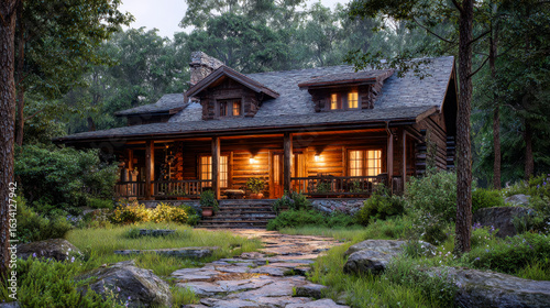 © Sergej Gerasimov, Fototapeta premium Cozy wooden cabin nestled in lush greenery with warm outdoor lighting and a stone pathway leading to the entrance