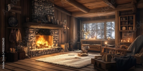 © Ali, Obraz premium Cozy wooden cabin with fireplace and snowy view.