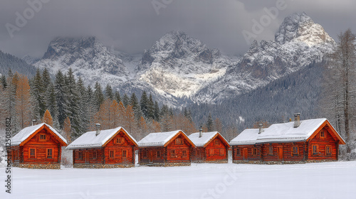 Fototapeta premium Cozy wooden cabins in snowy landscape with majestic mountains in background create serene winter scene. Perfect for winter retreats and nature lovers
