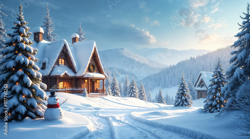 Naklejka premium Cozy wooden chalet celebrating christmas in a snowy mountain village