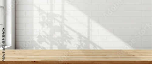 © TheWaterMeloonProjec, Fototapeta premium Cozy wooden kitchen table set against a white tile wall with sunlight, window, and leaf shadows, ideal for text design and product display in summer settings