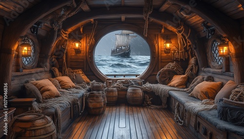 © Creative_Bringer, Naklejka premium Cozy wooden pirate ship interior, lit by warm lanterns, filled with ropes, barrels, and nautical tools, ocean view from the windows