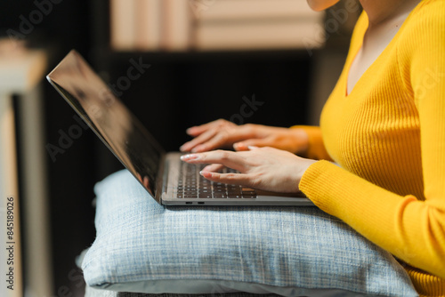 © Nittaya, Naklejka premium Cozy Work from Home: Woman in Yellow Sweater Using Laptop on a Pillow
