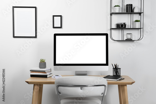 Obraz premium Cozy workspace with computer and stationery on wooden desk at home