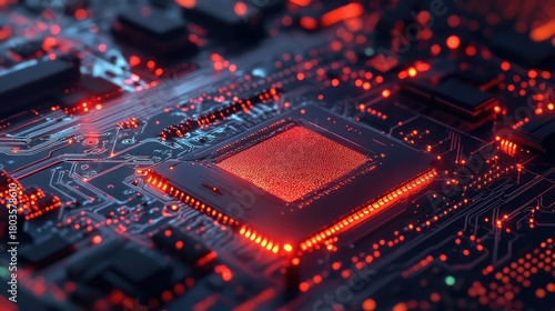 Fototapeta premium Cpu circuit board glowing red processing data concept