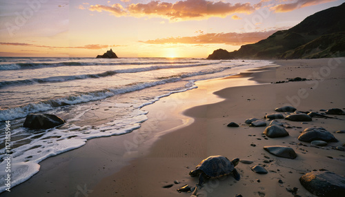 Fototapeta premium "Crépuscule sur la Plage avec Tortues"