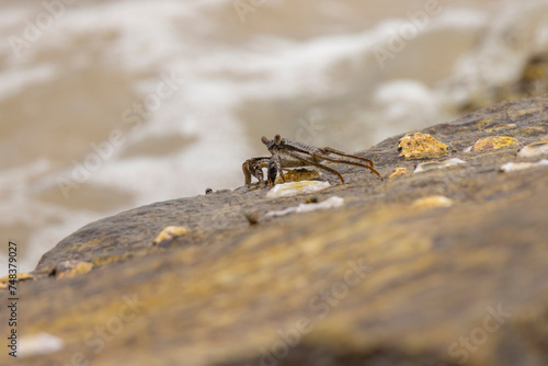 Fototapeta premium Crabs on rocks along the Indian Ocean coastline in natural native habitat, Bentota Beach, Sri Lanka