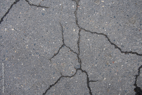 Fototapeta premium Cracked asphalt in the city, cracks and potholes on the road, textured road surface, selective focus.