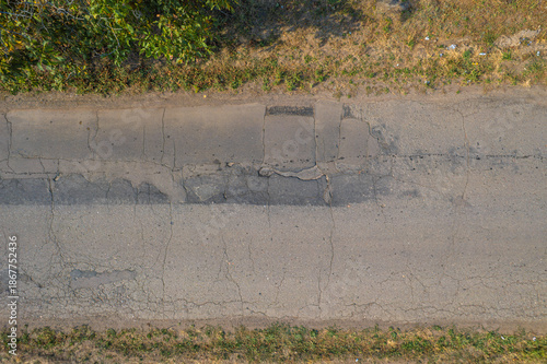Obraz premium Cracked asphalt road surface with damaged patches and dry roadside grass