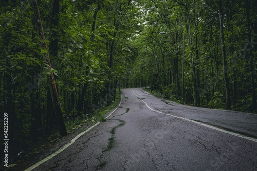 © Jameel A/Wirestock Creators, Fototapeta premium Cracked asphalt road through the forest with dense green trees