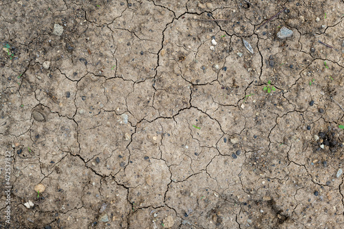 Fototapeta premium Cracked earth top view with some small seedlings. Dry soil background.