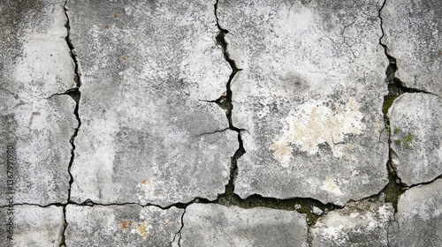 © Gufis, Obraz premium Cracked gray concrete pavement showing deterioration and weathering.
