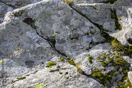 Obraz premium Cracked grey rocks covered with green moss on a bright sunny day. Uneven...