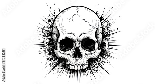 Fototapeta premium Cracked human skull with swirling abstract elements and ink splatter
