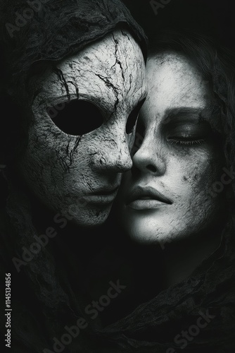 © jambulart, Fototapeta premium Cracked mask, weathered face, intimate monochrome portrait.