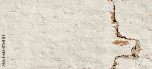 © Alex, Fototapeta premium Cracked Red Brick Wall With Shabby White Plaster Background Tex