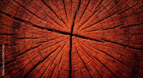 © Galadriel Gesso, Fototapeta premium Cracked Red Wood Tree Stump Radial Texture Background Close Up