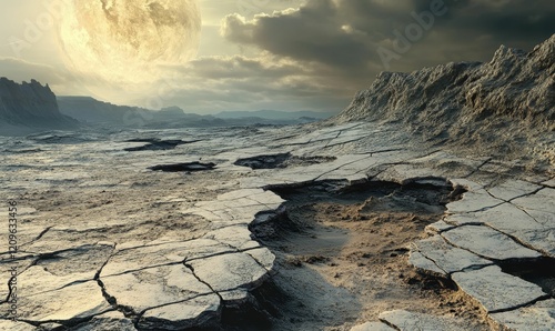 © jambulart, Obraz premium Cracked terrain under large moon with dramatic skies.