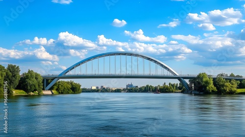 © Yusif, Fototapeta premium Cracow, Poland: View of the Józef Piłsudski road bridge spanning the Vistula River, featuring an arch-shaped steel structure. Focused detail.