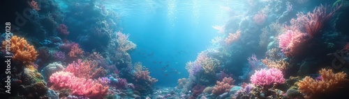 © Muhawaii, Obraz premium Craft a breathtaking 3D Visualization of a teeming Coral Reef, vividly showcasing underwater life interactions with bubbling oxygen pockets