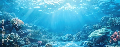 © Pattypatt, Fototapeta premium Craft a serene template highlighting ocean conservation, using blue tones and spacious copy areas.