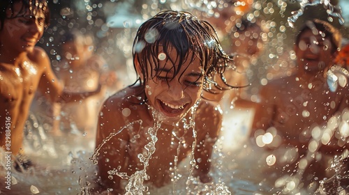 © Supasin, Obraz premium Craft an image of friends splashing each other in a playful water fight