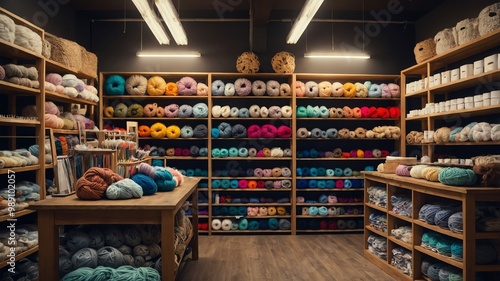 © Arceli, Naklejka premium Craft store shelves with knitting supplies background
