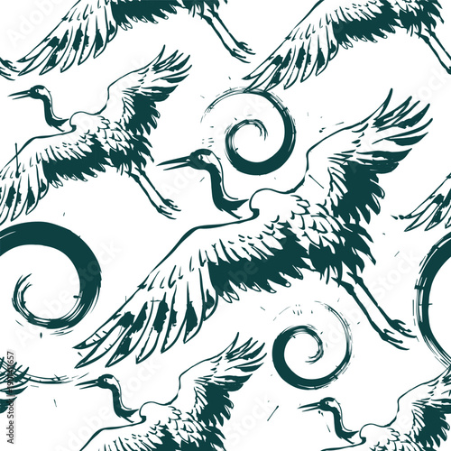 Fototapeta premium crane bird abstract japanese chinese seamless vector pattern ink design