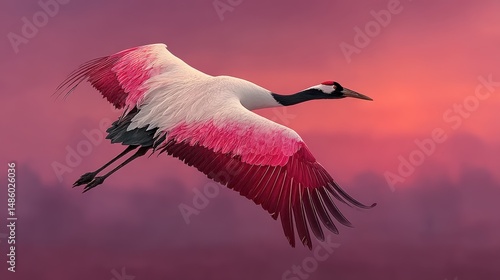© Suparat, Fototapeta premium Crane bird soaring across pastel sky, wings elegantly stretched, floating composition, elegant wings soft color palette crane in flight symbol of peace and longevity