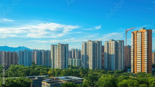 © ZHI, Obraz premium Crane Dominating Construction Site Against Blue Sky. Modern Urban Development and Construction Progress