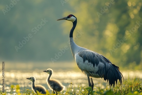 © Gelas, Obraz premium Crane Family by Riverbank at Dawn