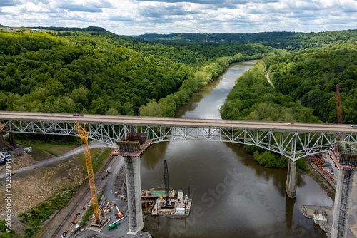© Midea , Fototapeta premium Crane lifting materials on bridge over river.