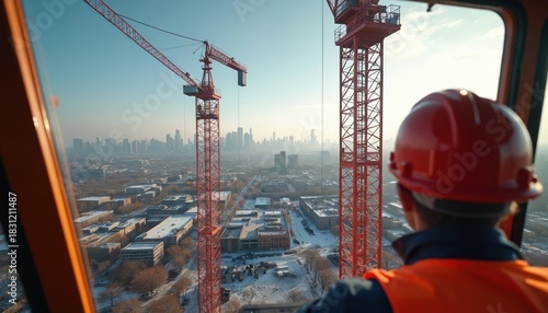 © Pete, Naklejka premium Crane operator observes cityscape from cabin. Person in hard hat oversees urban construction site. Tower cranes stand tall against skyline. Building activity takes place. Winter day with cold weather.