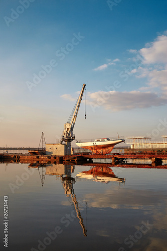 Fototapeta premium cranes in the evening port. sunny yacht club