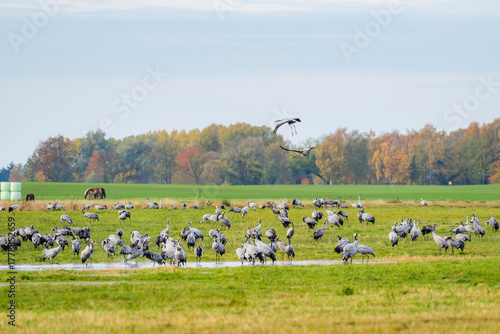 © Jens, Obraz premium Cranes Landing at Meadow Pond in Warm Morning Light, Mecklenburg-Western Pomerania