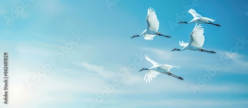 Obraz premium Cranes soaring in the springtime sky, with a peaceful blue backdrop and ample copy space image.