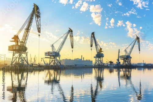 Fototapeta premium Cranes standing by the dock reflect in the calm waters under a sunset sky in a busy harbor