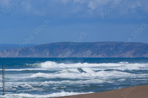 Fototapeta premium Crashing waves with mist rolling in to shore beautiful image for background with hills and bright blue sky