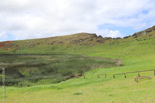 © Atlantis, Fototapeta premium Cratère du volcan Rano Raraku à l'île de Pâques