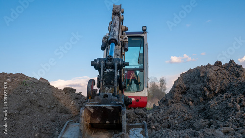 © majorstockphoto, Obraz premium Crawler excavator front view digging on demolition site.