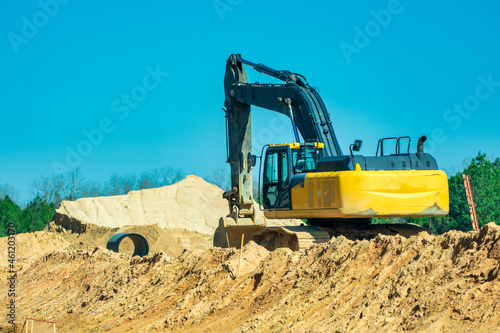 © jovannig, Obraz premium Crawler excavator front view digging on demolition site.
