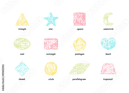 © Mariia Eliseeva, Fototapeta premium Crayon geometric frames. Pastel colored hand drawn circle, square, star, triangle, heart shapes. Vector chalk or pencil design elements. Best for kids style, invitation, texture, background