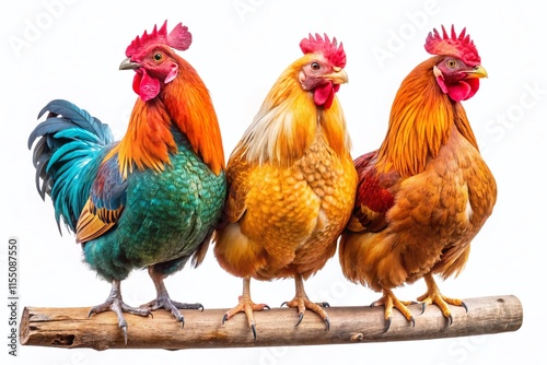 © chaowalit, Fototapeta premium Crazy Chickens on a Perch - Vibrant Farm Scene