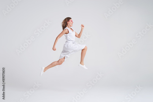 © ArtFamily, Fototapeta premium Crazy joyful girl in summer dress jumping isolated over background