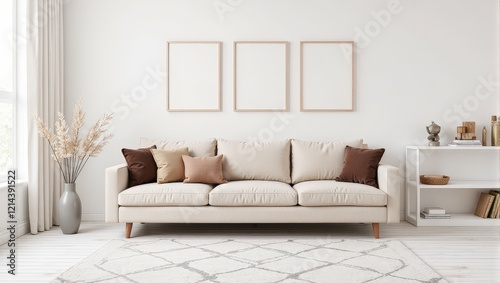 © AiPhotoSale, Obraz premium Cream-colored couch rests elegantly on polished horizontal wooden flooring, complemented by a chic gray-and-white rug below. The inviting indoor scene exudes cozy sophistication. (97 characters)
