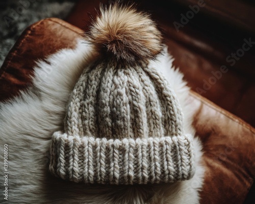 Obraz premium Cream colored, finely knitted beanie with subtle color variations, adding...