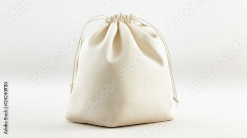 © daisha, Obraz premium Cream drawstring pouch on white background.