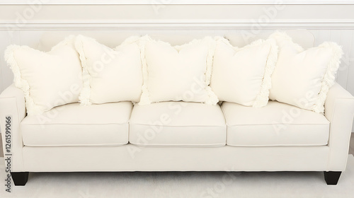 © Big9869, Obraz premium Cream Sofa with Fringe Pillows in Neutral Modern Interior Home Setting Luxury Decorative Cushions