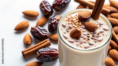 Fototapeta premium Creamy almond and date smoothie with cinnamon and seeds - a healthy treat