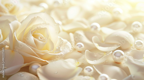 Obraz premium Creamy delicate roses and petals, pearls in soft lighting, elegant romantic...